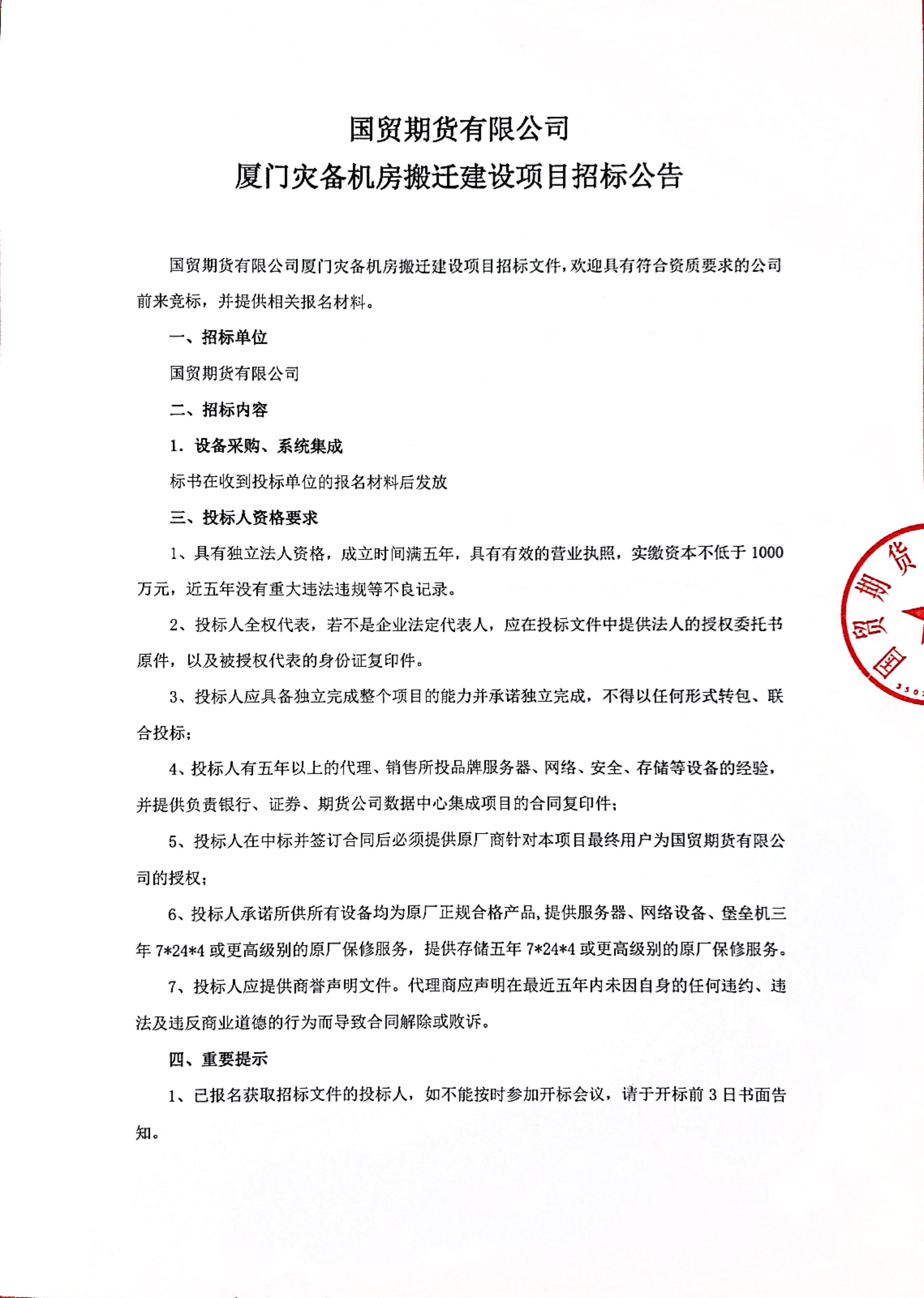【國貿(mào)期貨】廈門災(zāi)備機(jī)房搬遷建設(shè)項目招標(biāo)公告